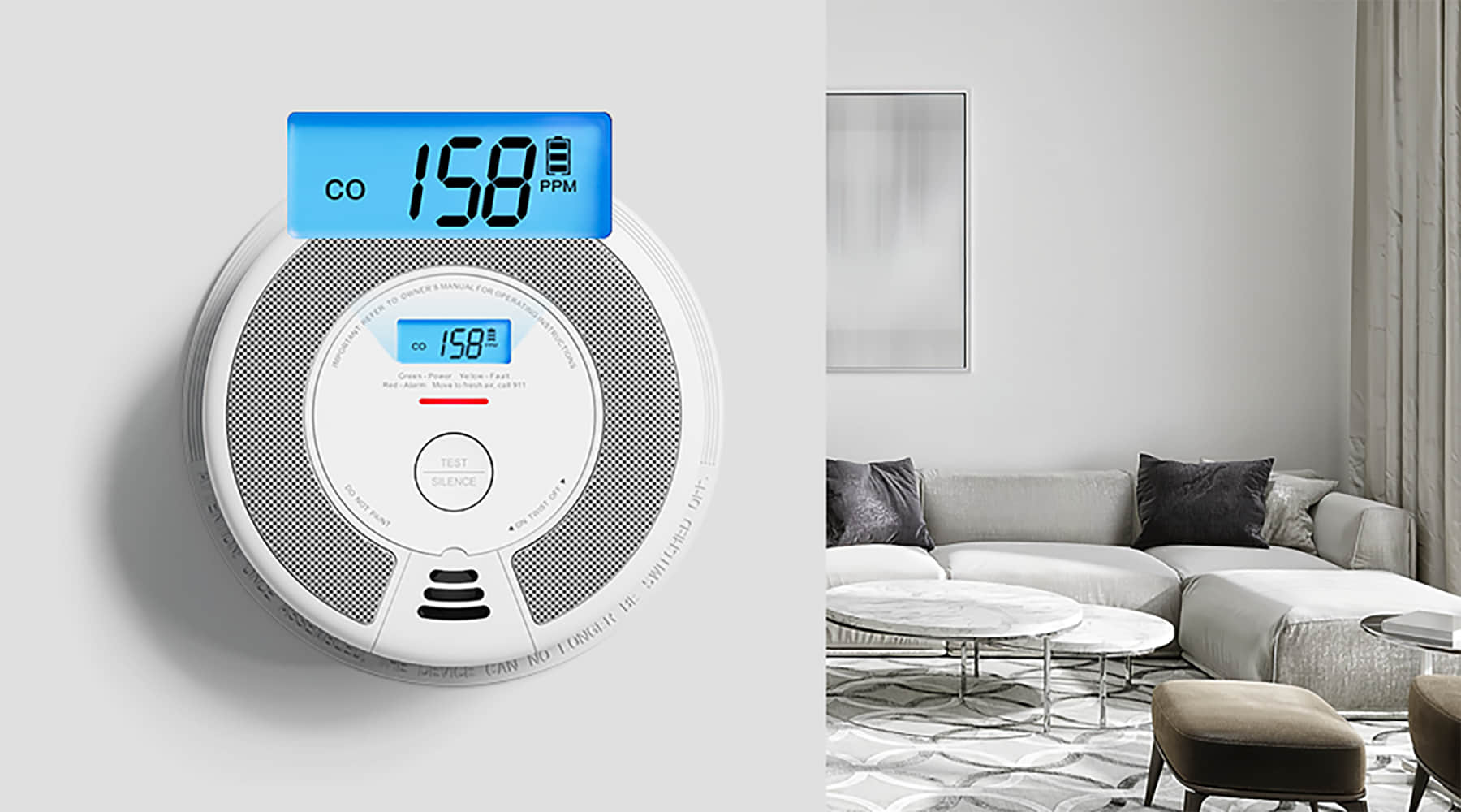 - Büyük ve okunması kolay LCD ekran, karbon monoksit seviyesini milyon başına parçacık (PPM) cinsinden göstererek, pil ömrünü göstererek ve cihazın durumunu görüntüleyerek bilgi sahibi olmanıza yardımcı olur.
