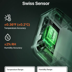 - İsviçre yapımı bir sensörle üretilen X-Sense STH0A, son derece hassas ölçümler sunar: Sıcaklık Aralığı: ±0,2°C doğrulukla -20°C ila 60°C. Nem Aralığı: ±%2 doğrulukla %0-99 RH. Bu, seralar, şarap mahzenleri veya bebek odaları gibi hassas ortamlar için hassas izleme sağlar.